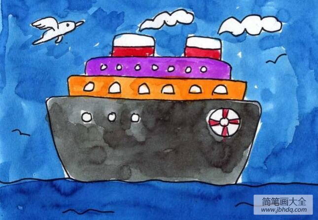 这是一艘看起来非常豪华的邮轮,但是同时绘画的方式也非常的简单,只要你跟着范画学,就一定能画好的。首先用一个黑色的记号笔画出轮船的大体框架,记得把你想画的水鸟等细节也画上,然后用你自己喜欢的水彩颜料给邮轮和大海涂上色就可以了。