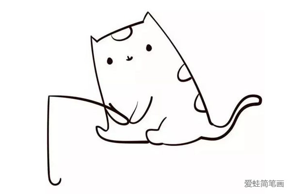 第六步从猫咪握着的手中间画出一根弧线,来代表鱼竿。不要太细哦。钓鱼竿的顶端往下,画一根直线,然后在直线尾部画出弯弯的钩子形状。