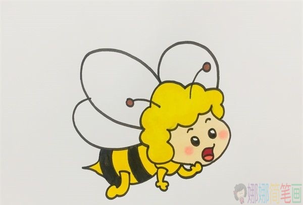 第四步:给蜜蜂的身体部分涂上黄色和黑色,头发涂上黄色,脸部涂上肤色,画上可爱的红色脸颊,点上棕色的触角
