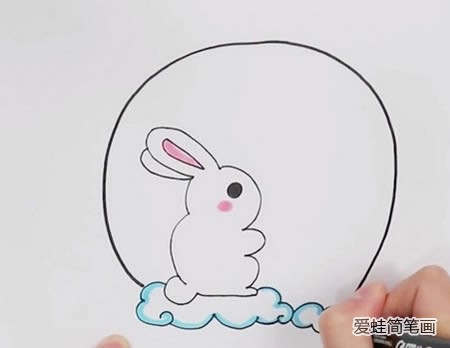步骤三:然后开始涂色,先给兔子的耳朵和腮红涂粉色,眼睛涂黑色,身下的云朵涂蓝色。