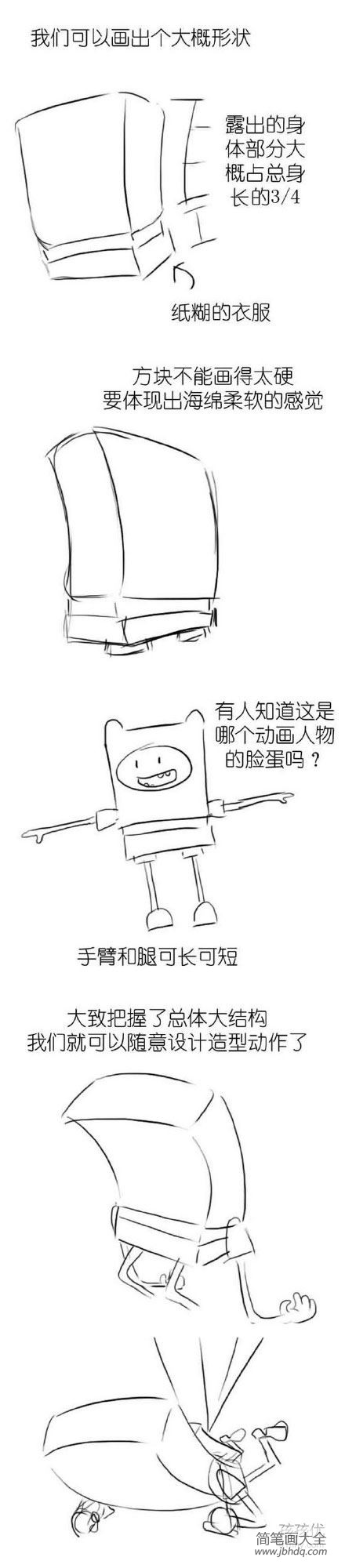 我们可以画出大概形状,露出的身体部分大概占总身长的3/4,勾画纸糊的衣服,方块不能画得太硬,要体现出还没柔软的感觉。画手臂的时候可长可短,大概把握好总体结构后我们就可以随意设计动作了。