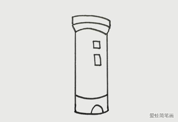 先画出一个圆柱,在上面画上门和两个窗户,上方画出小房子和尖尖的房顶,注意补充塔身的细节,并给塔身涂上蓝色,塔顶和底座涂黄色,简单的灯塔就好了。