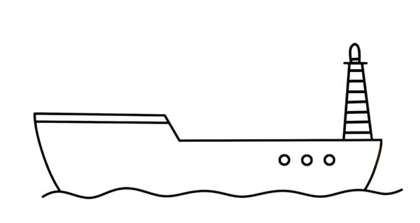 第一步:先画出渔船的基本轮廓,船下面要画上一条波浪线,表示它在海上行驶哦!