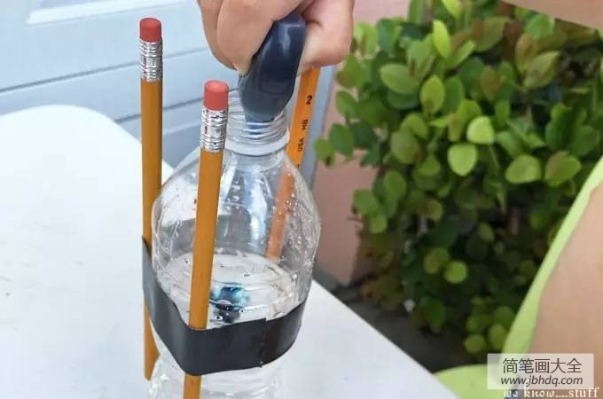 将三支铅笔用黑胶带固定在瓶子四周(带橡皮擦的一端比瓶口高),再倒入半瓶醋。