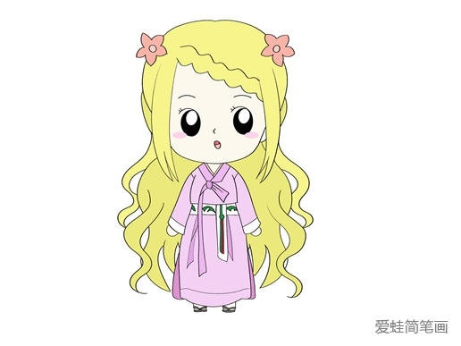 5、继续给灵公主的衣服涂上粉色和紫色,腰部涂上绿色,简单漂亮的灵公主简笔画就完成了。