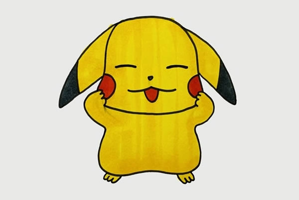 步骤四:最后把脸颊涂上红色,耳朵尖的位置涂上黑色,身体和脚涂上黄色,精灵宝可梦就画好了。