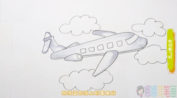 4、把机身涂完之后,用淡蓝色涂飞机玻璃,注意涂成条纹的、反光的感觉,然后用深蓝色涂周围的云朵,简单的飞机就画好了。