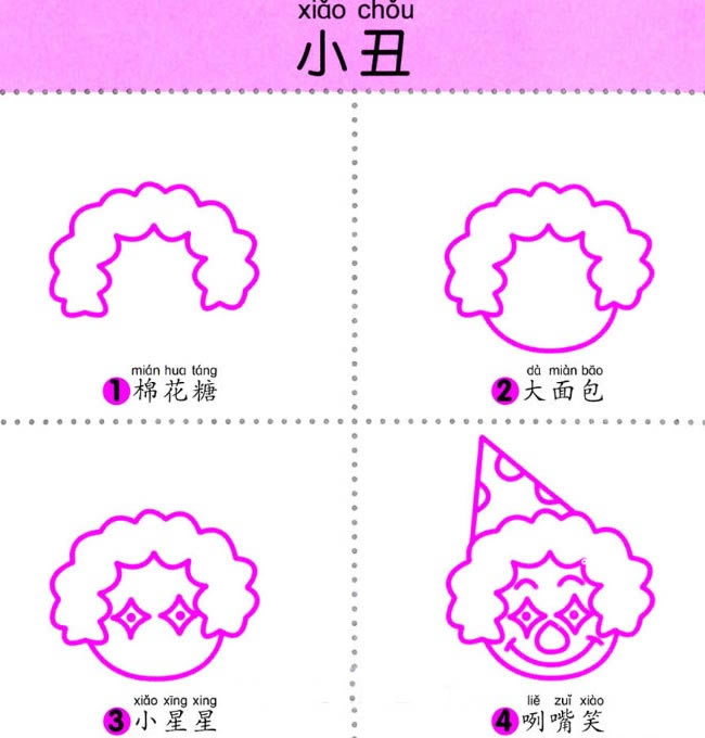 小丑总是表演诙谐幽默,打扮滑稽,惹人发笑,今天,我们就一起画一个简笔画小丑吧。