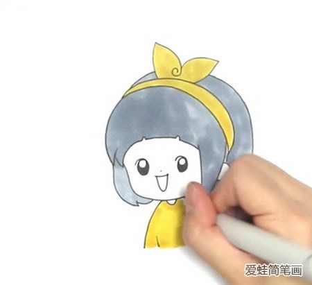 第三步:画完线稿后就可以开始给狄淇儿涂颜色了,首先用灰色的马克笔给狄淇儿的头发涂上颜色,接着用金黄色的马克笔,将狄淇儿的衣服和蝴蝶结发箍涂上颜色。