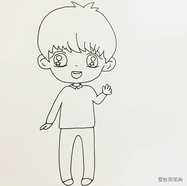 3、接着慢慢画出他的下半身,下半身穿着长袖衣服,一手置在身侧,另一手弯起打招呼。