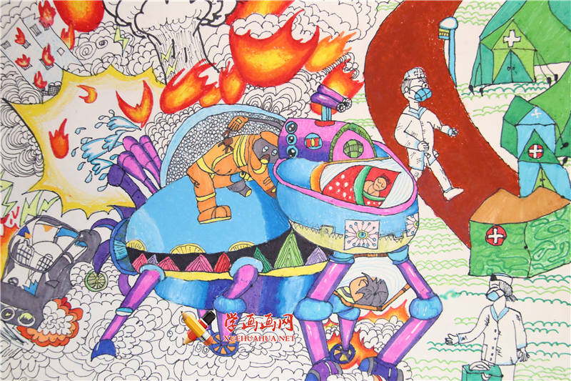 儿童科幻画作品:《争分夺秒》
