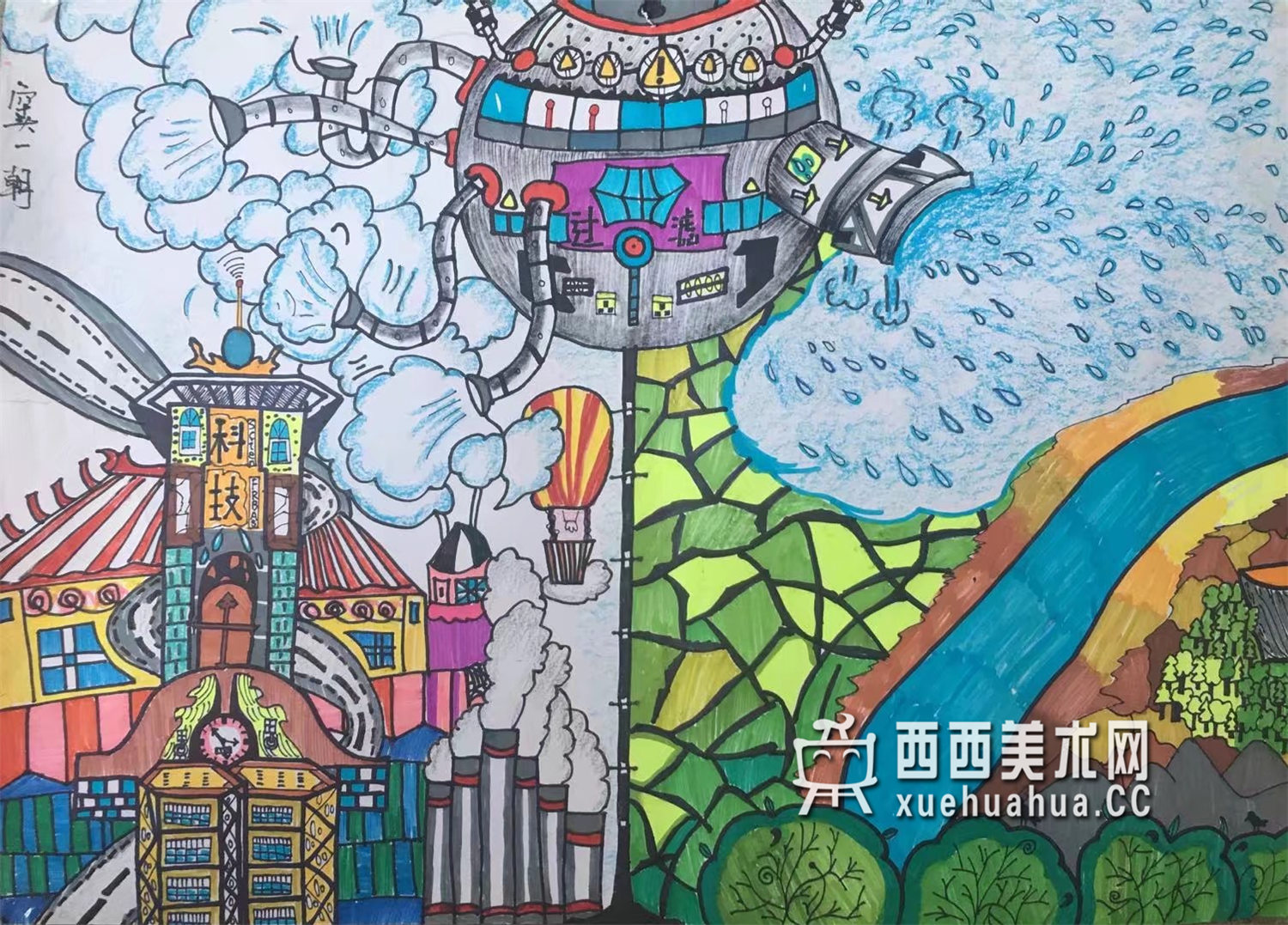 小学生获奖环保科幻画《“变废为宝”之废气转换器》赏析